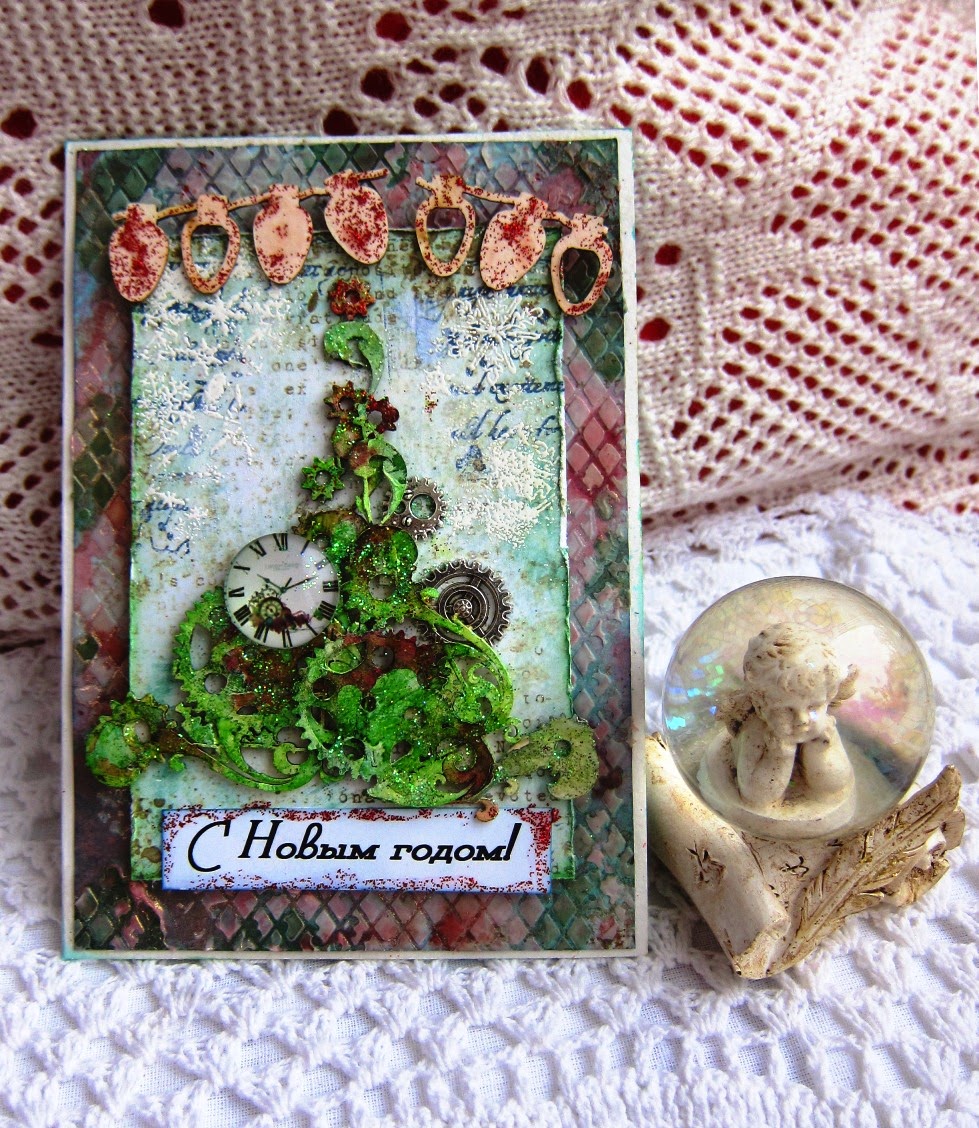 2. Открытка "Живая Механика-1" Почему-то очень захотелось совместить несовместимое - зеленую новогоднюю елочку и механические детали.